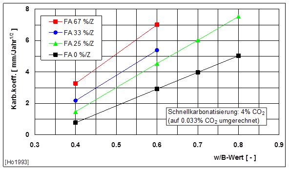 Bild 1: Einfluss des Wasser-Bindemittel-Wertes (w/B-Wert) und des Flugaschegehaltes auf den Karbonatisierungskoeffizienten.