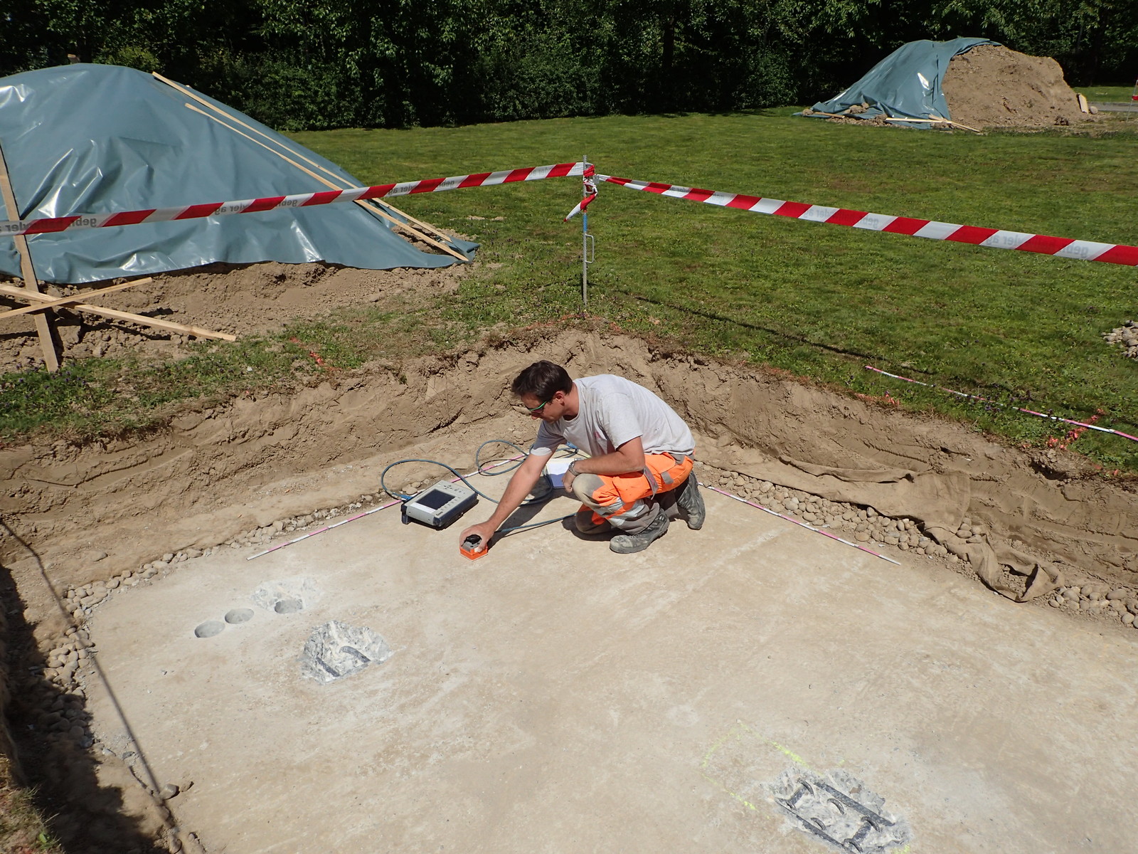 Mittels Georadar können Einlagen im Beton wie Bewehrungsstäbe, Vorspannglieder oder Leitungen zerstörungsfrei geortet werden.