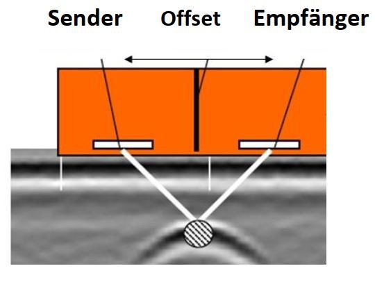 Beim Georadarverfahren wird von einer Antenne mit Sender und Empfänger (Abb. 2) eine elektromagnetische Welle ausgesendet. Diese verläuft je nach Leitfähigkeit des Gefüges unterschiedlich schnell und wird an Einlagen wie z.B. Bewehrungsstäben oder Elektroleitungen reflektiert. Die Reflexionen und die Laufzeit der reflektierten Wellen werden von einem Empfänger aufgezeichnet.